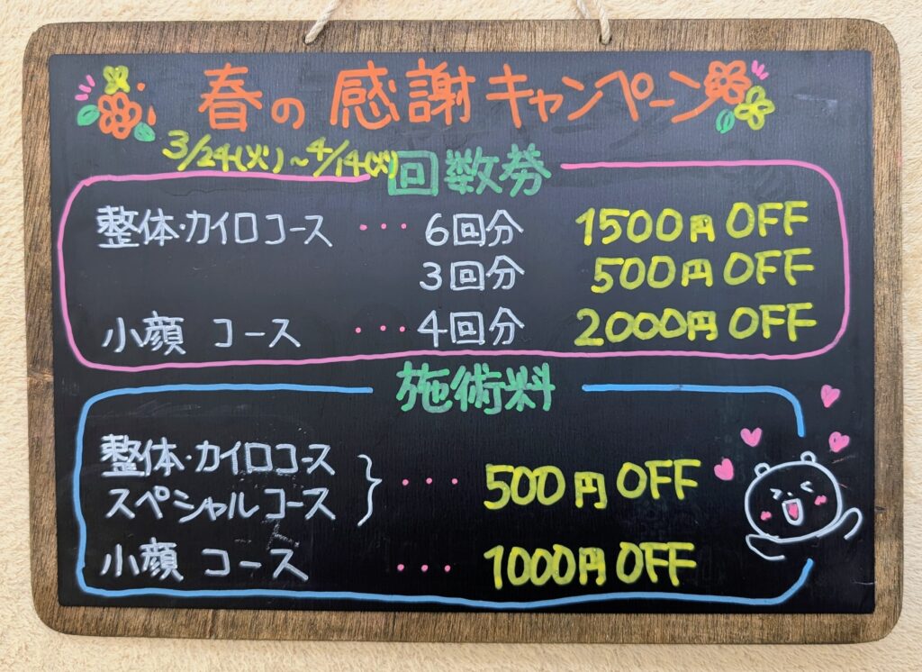 施術料や回数券割引など、大変お得な内容となっておりますので、この機会に皆様のご来院心からお待ちしています。