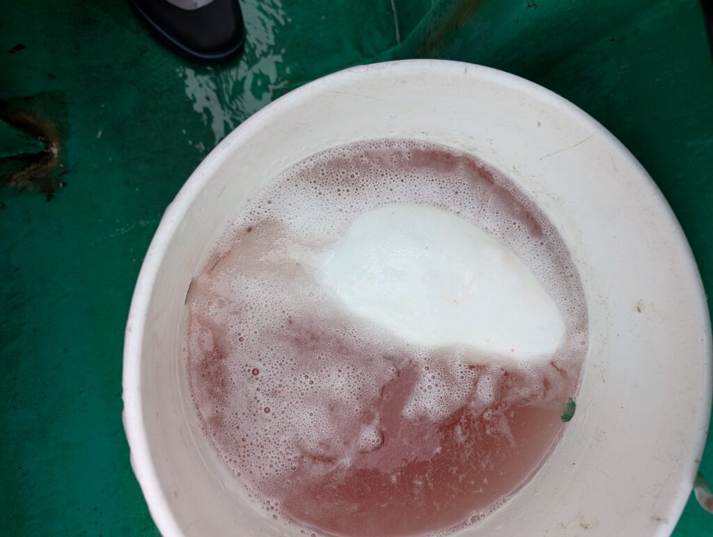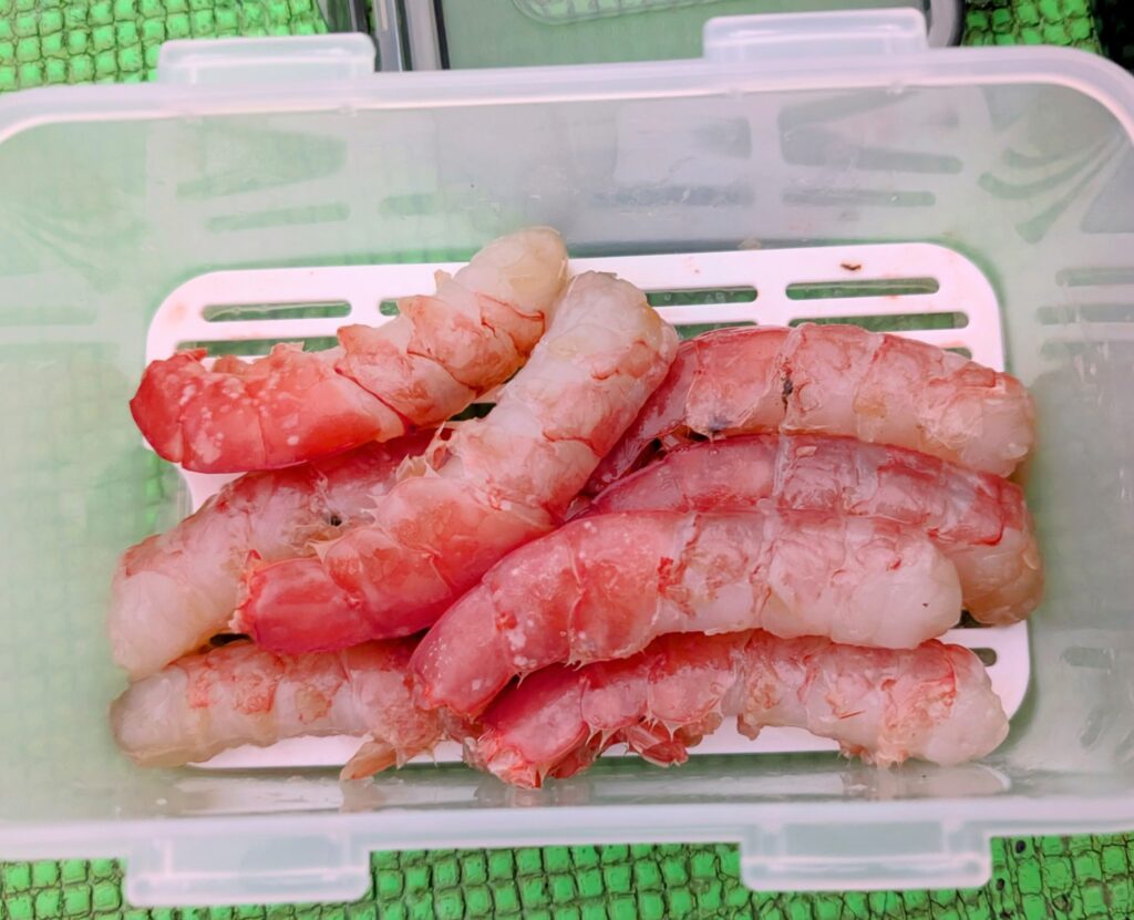 船宿さんから冷凍赤海老をワンパック(8匹)支給されますがカチカチに凍っていて解凍されるまで針に漬けづらいので、10匹ぐらい持参した方がよろしいかと。